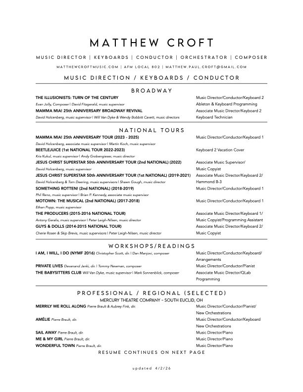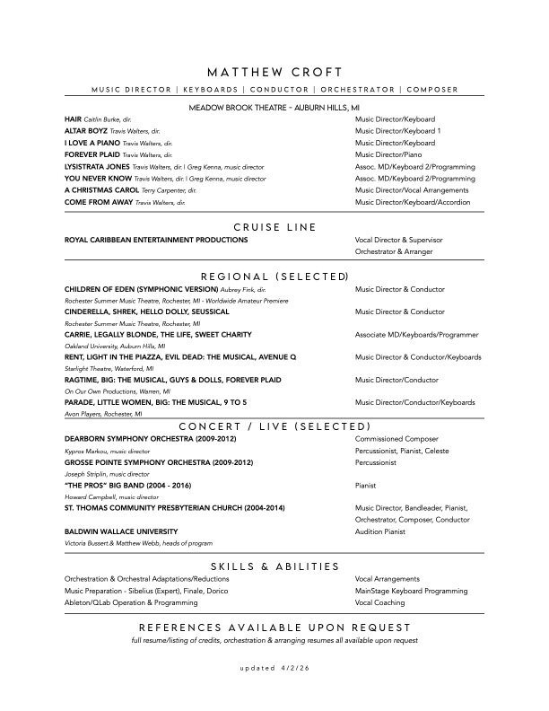 For reference contact information, or for a complete list of all credits and projects as well as samples of my music prep, composing, and arranging work, please e-mail me or contact me HERE.